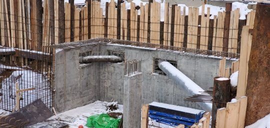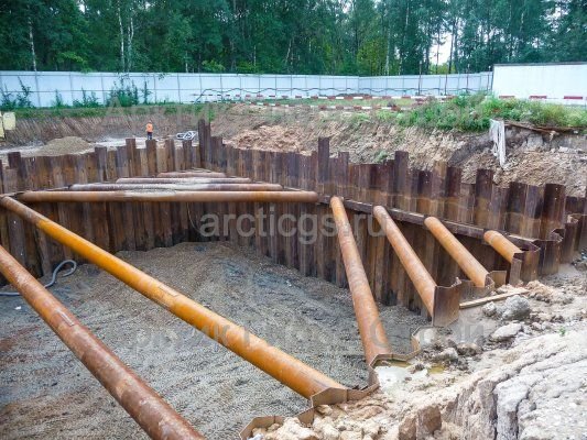 Шпунтовое ограждение котлована из шпунта Ларсена с распорами, выполненное специалистами «АрктикГидроСтрой»