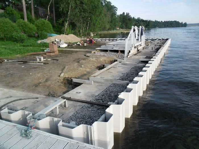 Монтаж понтонного пирса проще и дешевле других. Но у этого варианта много ограничений: пирс рекомендуется устанавливать в месте, закрытом от сильного ветра, при отсутствии сильных течений и волн.